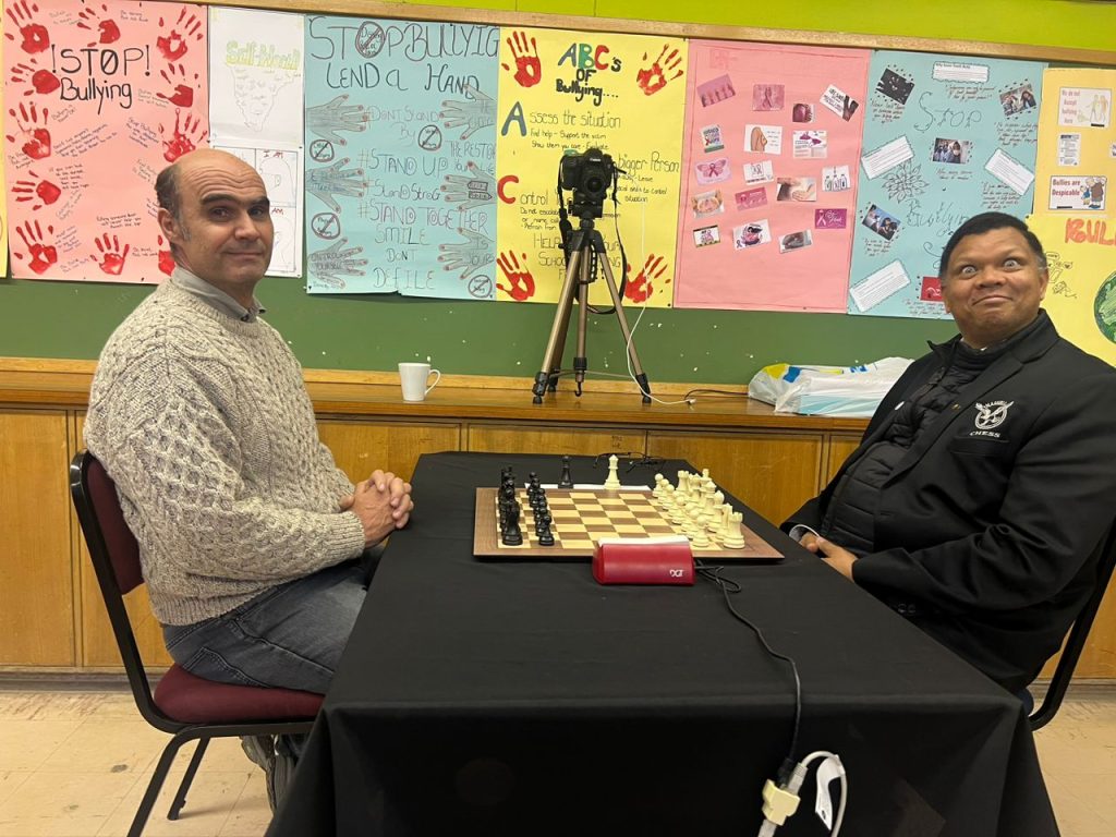 The event was a highly competitive tournament that led to an armageddon match due to a tie that had occurred in the earlier rounds. The armageddon match rules gave white 6 minutes and black 5 minutes playing time. Black only needing a draw or checkmate in-order to win the game. In the image is Mr Oberholzer Sanders(on the left) playing as black and Mr Nitzborn Max Baronon the right) playing as white.